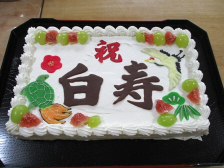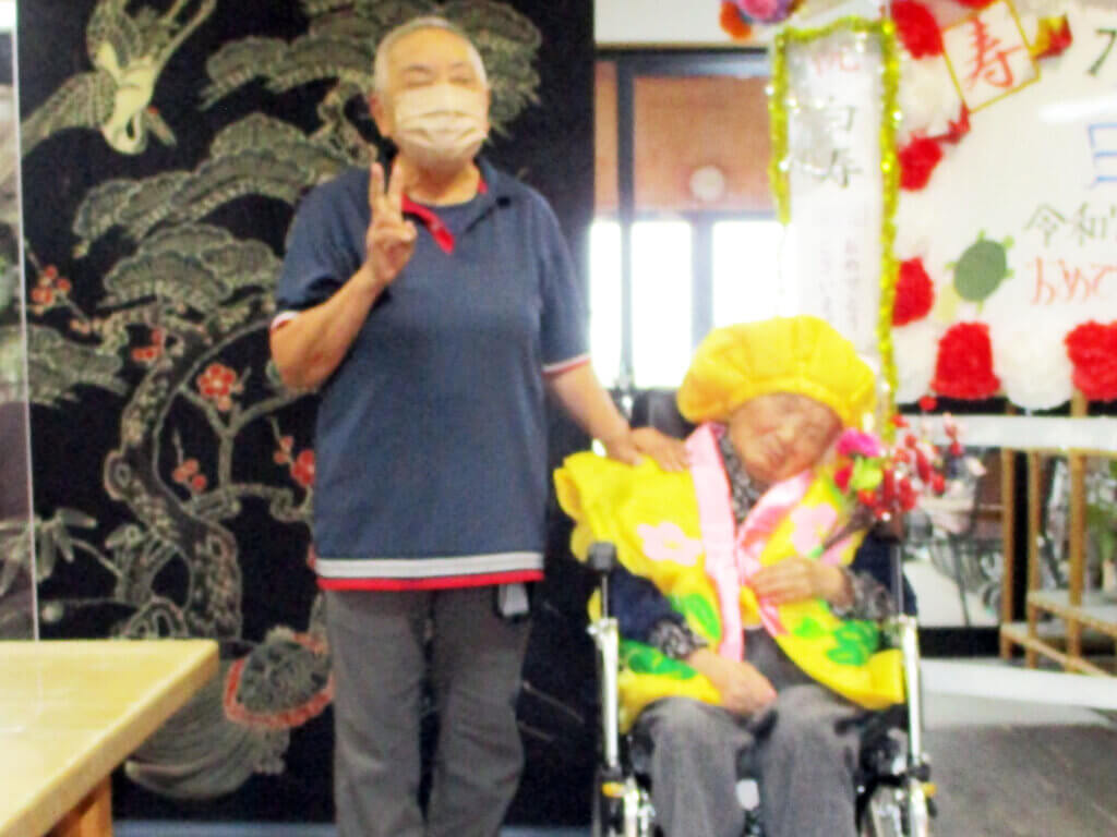 まさにこの日がお誕生日の利用者M.K様、99歳のお誕生日です。黄色のちゃんちゃんこを着ていただき、手には花。まずは祝いの歌を皆で歌い、くす玉を割って長寿を祝いました。その後祝いの豪華ケーキを皆で食べました。