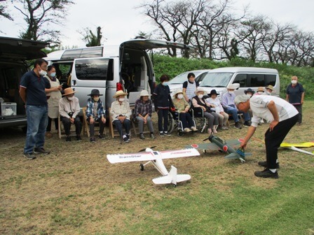 神通川河川敷では定期的にラジコン飛行機を愛好家が持ち寄り、デモ飛行を行なっているとのことで、その飛行を見せてもらおうと午後から利用者の皆様とともに、神通川の河川敷にドライブして参りました。