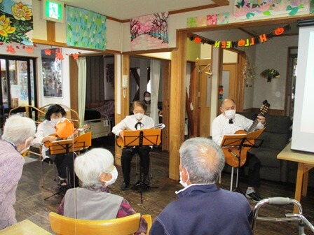 婦中ギター&マンドリンクラブ(今回は7名)様が来所されました。全22曲の演奏で、今回は童謡を中心としたプログラムで初秋の季節をテーマとした曲を演奏、懐メロなど良く知られた歌が流れ、利用者の皆様も声を合わせて一緒に歌いました。