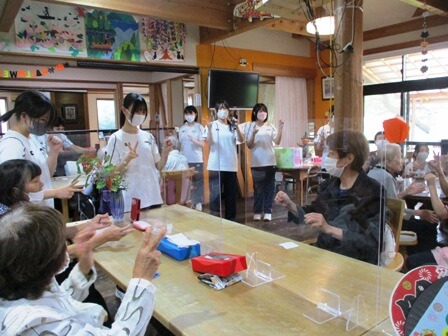 7日(火) 八尾高校福祉課の学生さん(総勢32名)が2グループに分かれて来所される第二弾。学生さん達は仲間はずれクイズやグーチョキパー運動等のレクリエーションプログラムで楽しませ、特にシーツ玉いれは大盛り上がりでした。