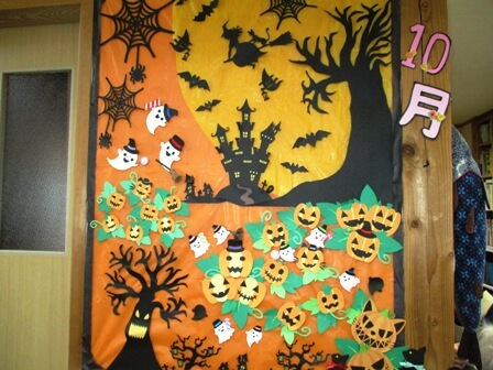 担当の職員が毎月季節の壁絵をデザイン。今月のテーマはハロウィン。