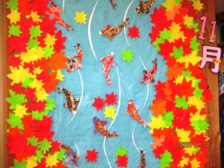 担当の職員が毎月季節の壁絵をデザイン。今月のテーマは紅葉流れる。