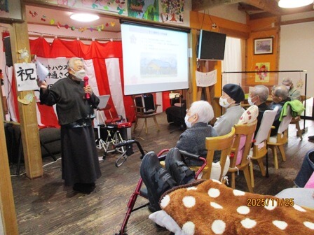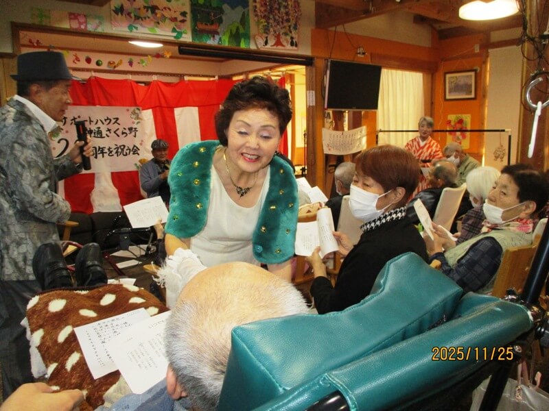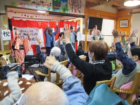 さくら野が創立して20年を迎え、それを祝う記念の会を行ないました。施設長のご挨拶の後、20年を写真で振り返るスライドショー。その後、ヨーコ&ハマーズ様4名が素晴らしい歌唱を響かせ、利用者・職員ともにその歌声に酔いしれ、次には職員から施設長・社長へ花束贈呈,万歳三唱で会を締めました。