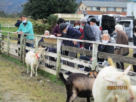 珍しくお天気が続いたこの日の午後、立山町あるぺん村周辺へドライブに行きました。極楽坂スキー場辺りの紅葉は7割程でしたが、きれいに見えました。あるぺん村ではいろんなヤギたちが寄ってきてくれて、利用者様たちは餌をやったりしながら、とても面白げにヤギの様子を見ていました。