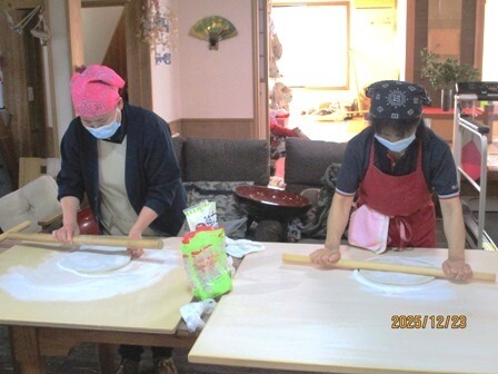 昨年好評だった、職員が蕎麦粉から手打ちそばを作るイベント。今年もやってしまいました。利用者様たちの前で蕎麦粉を捏ね、のばし、切るまでの工程を見ていただき、そのお蕎麦は昼食として美味しく頂きました。「こしがあっておいしい」と大好評です。