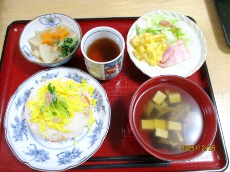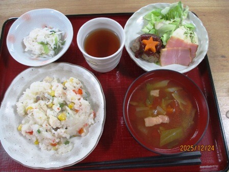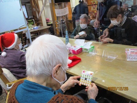2日目はビンゴ大会でプレゼントをゲットして頂きました。お昼ごはん、オヤツは大好評、厨房様力作のクリスマスメニュー。ご覧ください!