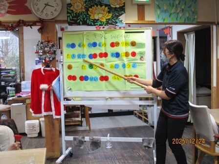 毎年恒例のクリスマス行事。クリスマスの壁飾りの前で利用者の方々にサンタの扮装で写真撮影を行ないました。