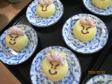 2日(月)~4日(水)の三日間、恒例の節分の行事です。本祭は3日として、今回は社長・男性社員の二人が鬼に扮装し、利用者様に厄払いとして豆(を模した新聞玉)をぶつけてもらう事をやって頂きました。また鬼の的宛ゲームも開催!そしておやつは渾身の鬼ケーキです!