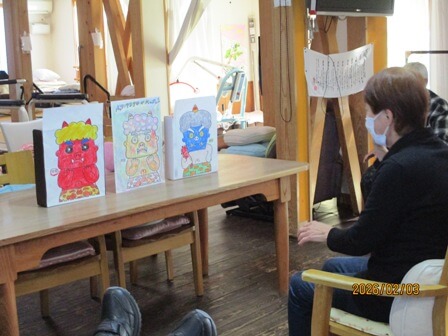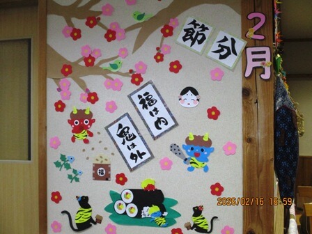 担当の職員が毎月季節の壁絵をデザイン。今月のテーマは節分。