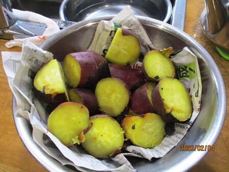 利用者様に薩摩芋を包んでいただき、暖炉の火の中へ。火の勢いに注意して、様子を見ながら焼き上げました。ホクホクの焼き芋。「甘くておいしい」と大好評です。